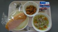 パン 牛乳 キャベツとベーコンのスープ チリコンカン 小魚