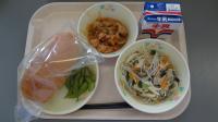 キャロットパン 牛乳 ビーフン汁 鶏肉のトマトソース煮 枝豆の塩ゆで