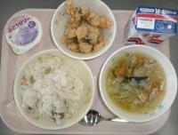 えびピラフ 野菜たっぷりスープ ホキのころもあげ 牛乳 ぶどうゼリー