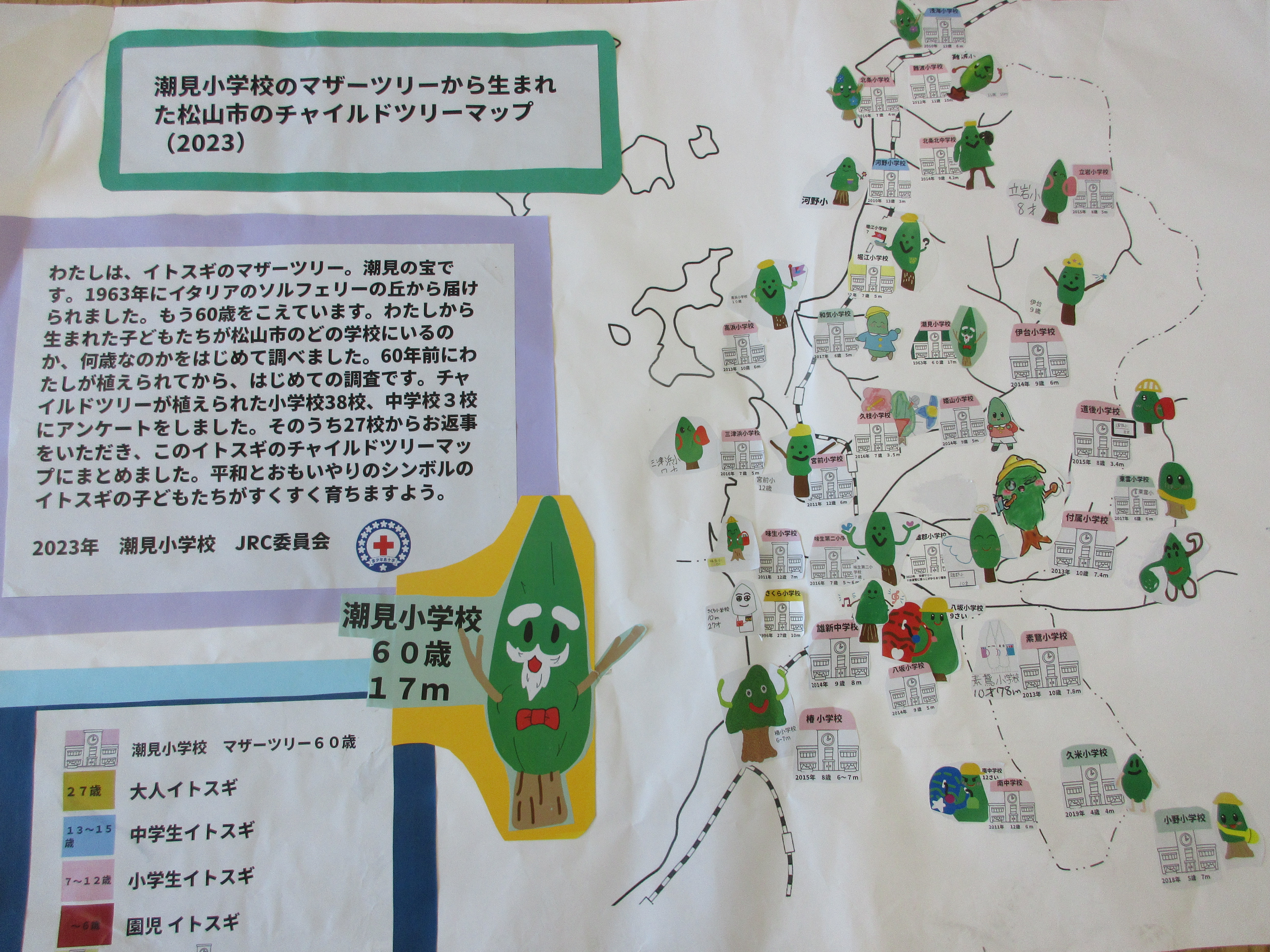2024年1月18日 19時14分JRC委員会では、1年をかけて潮見小学校のイトスギの種から生まれたチャイルドツリーの調査をしてきました。イトスギの子どもたちが育っている小学校38校、中学校3校に手紙を送り、28校から返事をもらいました。調査の結果や子どもたち手作りのチャイルドツリーマップ、協力してくれた学校へオリジナルのチャイルドツリーイトスギのイラストなどを封筒に入れ、発送の準備を進めています。60年ではじめての調査ができたことに、みんなワクワクしています。