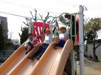 公園では、遊具のブランコやシーソー、すべり台で遊んだり、